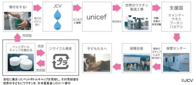 同社は2011年から、店頭で回収したペットボトルキャップをリサイクル資源として売却し、その売却益を寄付している。寄付金は、ポリオワクチンをはじめ各種ワクチンとなり、支援を必要とする世界の子どもたちに贈られている。その累計寄付額は892万7854円になる。