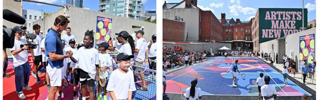 今回は、ニューヨークの現代アートを象徴するアーティスト、KAWS(カウズ)のアートワークが表面を彩る特設テニスコートで、テニスを通じた教育活動に取り組む地元の「キングスカウンティテニスリーグ」の子どもたちに、テニスを教えたり、アスリートやコミュニティのリーダーにとって大切なことを伝えた。