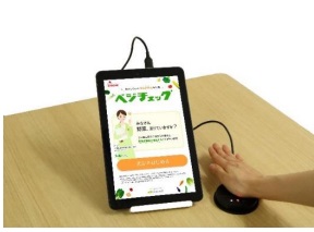「ベジチェック®」は、手のひらをセンサーに約30秒押し当てるだけで、簡単に野菜摂取量を推定できる機器。センサーのLEDから照射された光が皮膚に反射し、皮膚のカロテノイド量を測定する。カロテノイドは野菜に含まれる成分で、野菜を摂取すると体内に吸収されて皮膚に蓄積される。