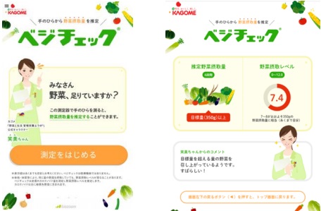 機器が、さまざまな深さや角度から得られる反射光を測定し、カゴメ独自のアルゴリズムでカロテノイド量を計算して、野菜摂取レベルや推定野菜摂取量を表示する。2~4週間前までの食生活状況を反映して、野菜摂取レベルは0~12.0の120段階で表示される。たとえば7~8のレベルは、おおよそ350gの野菜摂取量に相当する。