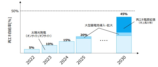 イオンモールでは2040年目標達成に向けた今後の課題として、再エネ自給率の引き上げを掲げており、今回、2030年度までの具体的な数値目標とアクションを定めた。