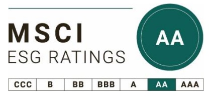 「MSCI ESG レーディング」とは、MSCI ESGリサーチの提供するESG投資の世界的な評価指標とされており、業界固有のESGリスクおよび、同業他社と比較した当該リスクに対する管理能力に応じて、企業のESGパフォーマンスを最上位評価の「AAA」から最下位評価の「CCC」まで7段階で評価するもの。