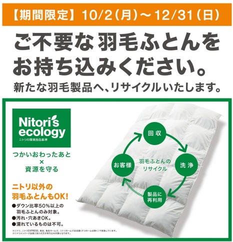 ニトリnews|「⽻⽑布団のリサイクル回収」10/2から期間限定で実施