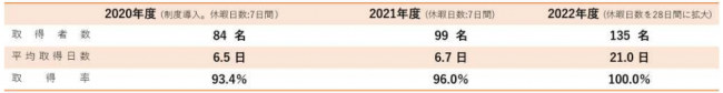 過去2年の実績と比較すると、取得率と共に、取得人数、平均取得日数も向上している傾向がみられる。2022年度は、135名が平均21日間の休暇を取得した。