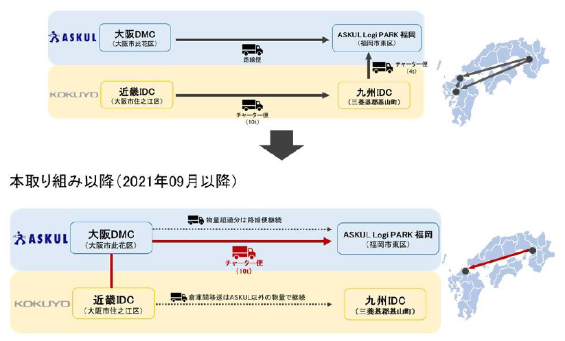 従来、関西地域でコクヨサプライロジスティクスからアスクルへコクヨ社製品を納品するには、コクヨ「近畿 IDC」(大規模大阪拠点)からチャーター便を手配して一度コクヨ「九州 IDC」(小規模九州拠点)へ在庫輸送し、そこからアスクルの物流センター「ASKUL Logi Park 福岡」(以下「ALP 福岡」)に納品をしていた。一方アスクルでは、日々の需要変動に応じ自社物流センター「大阪 DMC」から「ALP 福岡」へ在庫商品を移動する「物流センター間輸送」が発生し、路線便を手配して横持ち輸送を行っていた。今回、両社が最終的には同じ拠点「ALP 福岡」に向けて類似した輸送を行っていることに着目し、両輸送を共同で行うことで輸送車両を集約する実証実験の開始に至った。