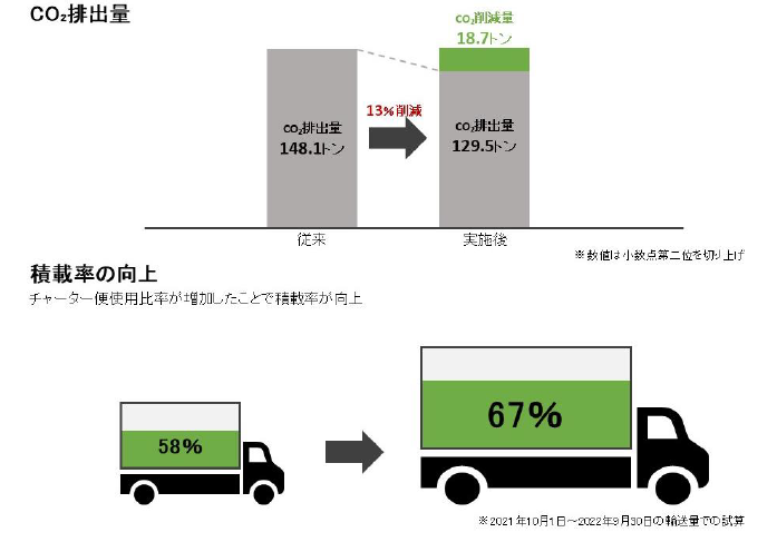 2021年9月から実証実験を開始し、2022年10月からは本格的稼働し、現在は合積みによる輸送効率の更なる向上を目指している。輸送車両を集約したことにより、CO2排出量18.7トンを削減、車両積載率9%向上を実現した。