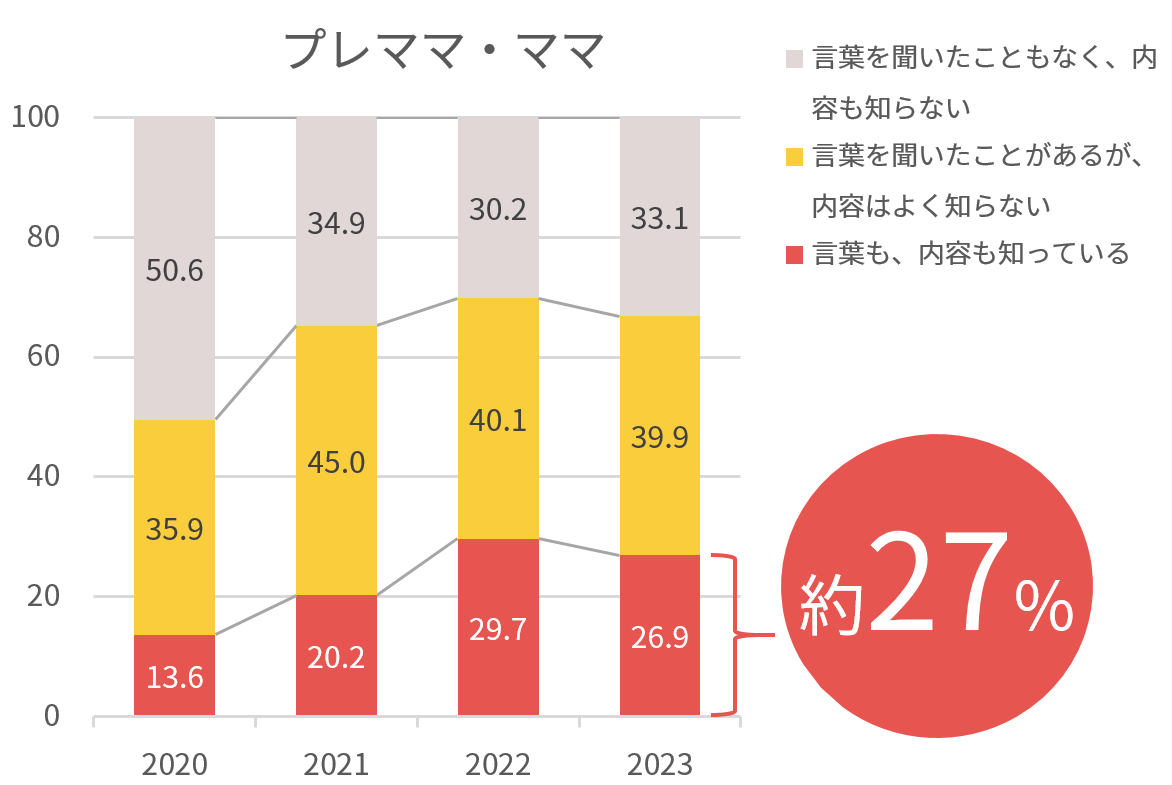 ・属性比較では、「言葉も内容も知っている」と回答したママは31%だったのに対し、プレママは約23%に留まる。