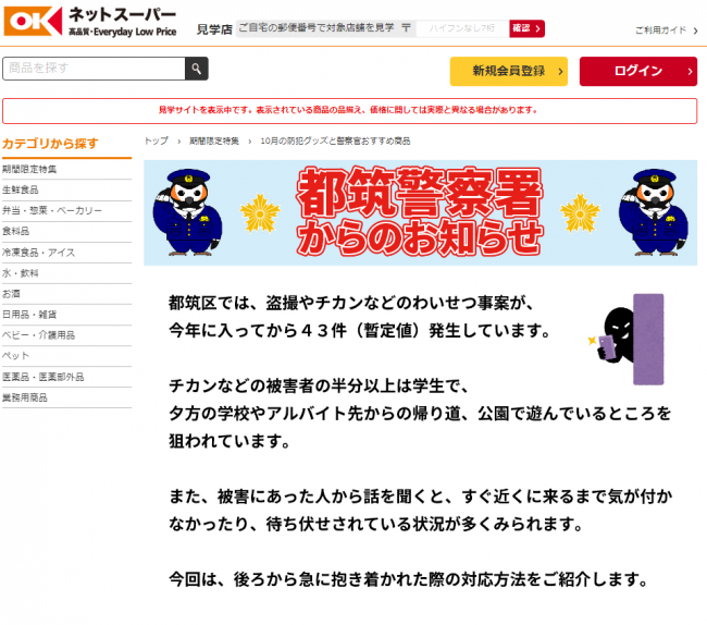 流通スーパーニュース > CSR > オーケーnews|ネットスーパーと都筑警察署の地域協定を締結 オーケーnews|ネットスーパーと都筑警察署の地域協定を締結 CSR / 2023年10月12日 ツイート オーケー(株)(東京都目黒区、二宮涼太郎社長)は10月5日(木)、神奈川県都筑区の都筑警察署と防犯・交通安全に関する地域協定を締結した。協定は10月5日から12月31日までの期間の取り組みとなる。 神奈川県都筑区内の犯罪や交通事故等の発生状況を効果的に周知し、注意喚起を図るため、子育て・共働き世帯の利用が多いオーケーネットスーパーのサイト上に防犯・事故抑止に関する情報を月替わりで掲載する。 ツイート