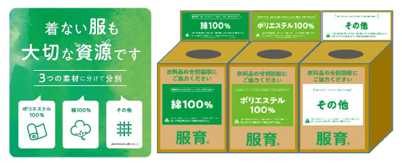 不要になった衣料品を「綿100%」「ポリエステル100%」「その他」の3つに分けて顧客自身に分けて回収ボックスに入れてもらう。顧客自身に素材分別をしてもらうことで環境に対する認識を深めてもらう。また効率的な衣料回収にもつなげる。