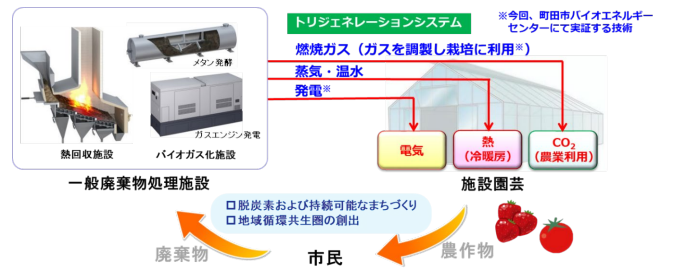 この技術の実現により、一般廃棄物処理施設で生み出される電気、熱、CO2を大規模施設園芸に利用するトリジェネレーションシステムの実用化を目指す。トリジェネレーションシステムとは、発電において発生する電力、熱に加えて、燃焼ガスに含まれるCO2を植物の育成促進に有効活用するエネルギー供給システム。電気・熱・CO2の3つ(トリ)を利用する仕組みを意味している。