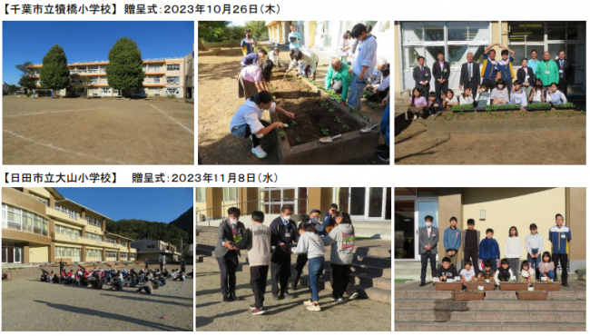 2023年度は、昨年を越える2455通の応募の中から抽選で全国300の小学校に各250株ずつ、花の苗を贈呈した。10月26日(木)には千葉市立犢橋小学校、11月8日(水)には日田市立大山小学校で贈呈式を執り行った。