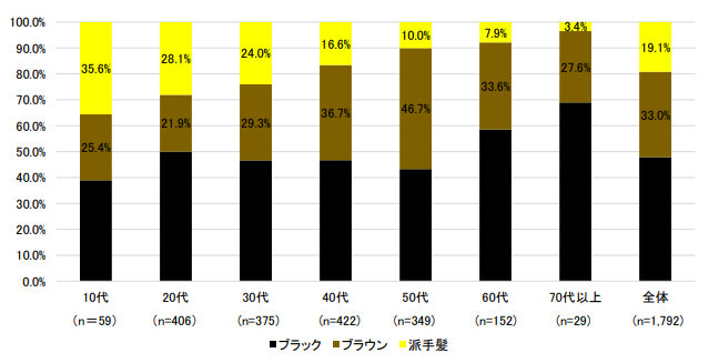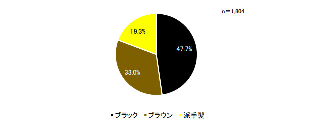 実際の髪色は、47.7%が黒髪、33.0%がブラウン系、19.3%が派手色(ベージュグレー/アッシュ/ゴールド/シルバーなど)となり、半数以上がカラフルな髪色を楽しんでいる。