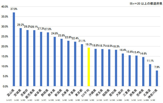 年代別では、10代が「派手髪」率35.6%と高いが、どの年代にも「派手髪」従業員がいるという結果になった。都道府県別では、全国の従業員が自由に髪色を楽しんでおり、カラフルな髪色従業員は地域・年代問わず約2割にのぼることがわかった。