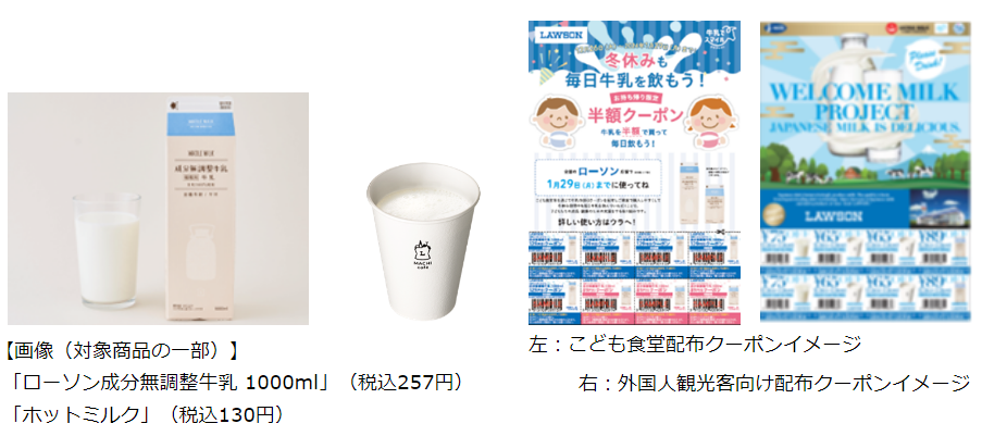 (株)ローソン(東京都品川区、竹増貞信社長)は、農林水産省と一般社団法人 Jミルク(東京都千代田区)が立ち上げた「牛乳スマイルプロジェクト」の一環として、冬休み期間を含む12月26日(土)~1月29日(月)の期間、全国のローソン1万3978店舗(ローソンストア100を除く)で利用できる、こども食堂に通うこども向けに牛乳の半額クーポンを配布する。また、日本に訪れた外国人観光客向けにも、同様に全国のローソン店舗で利用できる半額クーポンを配布する。