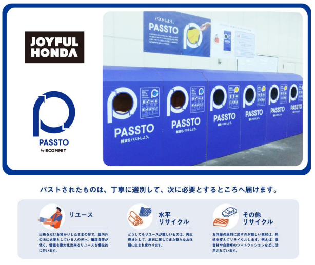 (株)ジョイフル本田(茨城県土浦市、平山育夫社長)と資源循環型ビジネスを展開する(株)ECOMMITT(鹿児島県薩摩川内市、川野輝之代表取締役CEO)は、12月18日(月)から不要品の回収・選別・再流通を一気通貫で行うサービス「PASSTO(パスト)」をジョイフル本田瑞穂店に導入し、衣類などの無料回収を開始する。