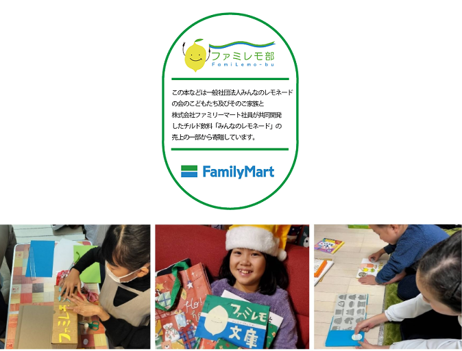ファミリーマートの社員が「みんレモサンタ」会議に3回参加し、どんな活動をしたらよいか相談。「みんなのレモネード」開発のきっかけが絵本だったことから、入院中のこどもたちが楽しめる本やDVDなどを「ファミレモ文庫」として贈ることとなった。