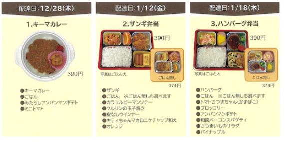 育ち盛りの児童に合わせ栄養のバランスを考え、3種類用意する。また夏休みに提供したときの経験をふまえ、児童に人気のキーマカレーを新たに追加した。ザンギ弁当とハンバーグ弁当はごはんの量を大・小・無と選択が可能。保護者にも児童にも喜んでもらえる昼食を目指す。