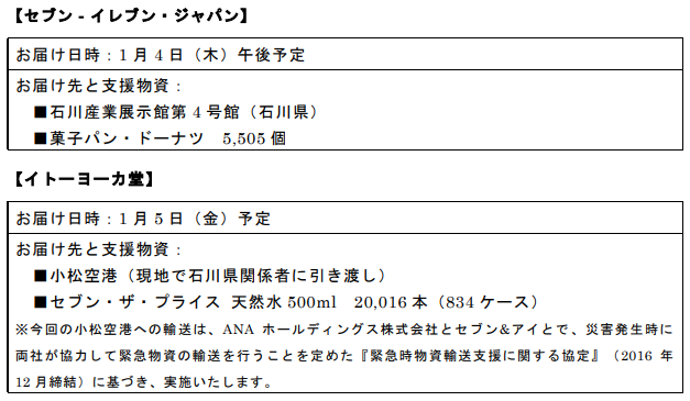 流通スーパーニュース > CSR > セブン&アイnews|「能登半島地震」支援物資の供給開始/第2弾まで予定 セブン&アイnews|「能登半島地震」支援物資の供給開始/第2弾まで予定 CSR / 2024年01月05日 ツイート (株)セブン&アイ・ホールディングス(東京都千代田区、井阪隆一社長)は能登半島地震被災地への支援物資の供給を進めている。 1月3日(水)午後にセブン-イレブンが石川県七尾市役所、富山県氷見市役所セブンプレミアム 天然水 2L200 ケース(1200本)の供給を完了した。第2弾ではセブン-イレブンが引き続き菓子パン、ドーナツ、イトーヨーカ堂が天然水の供給を実施する。 ツイート
