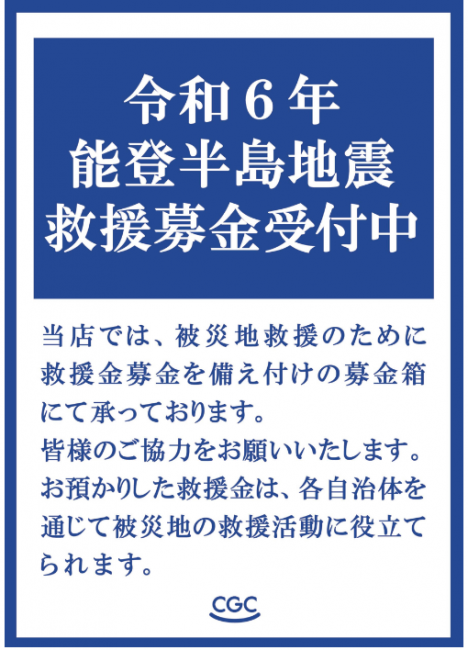 流通スーパーニュース > CSR > CGCnews|「能登半島地震 救援募金」グループ全店で実施 CGCnews|「能登半島地震 救援募金」グループ全店で実施 CSR / 2024年01月05日 ツイート (株)シジシージャパン(東京都新宿区、堀内淳弘代表)は「令和6年能登半島地震」をうけて、全国のCGCグループ加盟店の店頭での救援募金実施を発表した。 実施期間について、開始日は各社によって異なるが、1月31日(水)までを予定している。CGCグループは2023年10月時点で208社4433店舗の規模。集まった募金は、被災自治体に届けられる。 ツイート