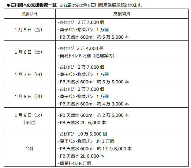 流通スーパーニュース > CSR > ファミマnews|能登半島地震被災地への支援物資提供を進める(1/9付) ファミマnews|能登半島地震被災地への支援物資提供を進める(1/9付) CSR / 2024年01月09日 ツイート (株)ファミリーマート(東京都港区、細見研介社長)は能登半島地震の被災地である石川県に、おむすび、パン、水、簡易トイレなどを支援物資として提供している。 支援物資の提供は1月5日(金)から開始している。被災地域や行政と連携を強化し、対応していて、今後も、メーカーや工場、配送業者など同社のサプライチェーン全体で連携を図りながら、支援物資の提供を継続していく。 ツイート