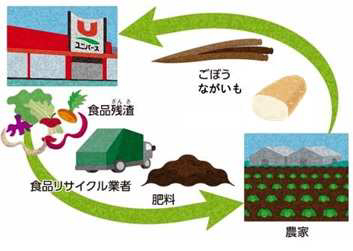 ユニバースでは店舗で発生した野菜や肉・魚、惣菜などの食品残さを食品リサイクル業者が堆肥化し、協力農家にその堆肥を使用して生産された農産物を、店舗で販売している。