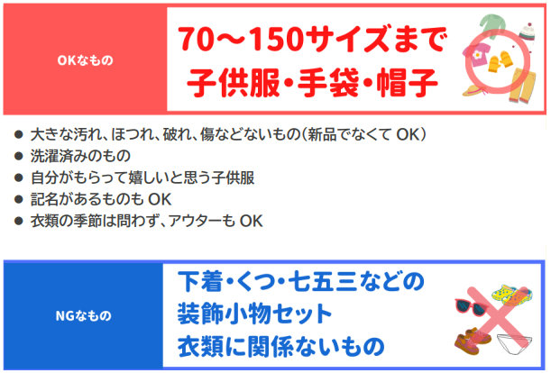 「お下がり回収」とは、家庭で余っている子供服を店頭のボックスで回収し、「お下がり交換会」(「おさがりくるりん」というイベントで2016年から実施)を通じて、子供服を必要としている子育て世帯にお下がりを寄付する活動のこと。