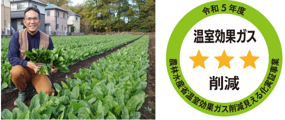 「セブンファーム東京(立川)平野さん」で栽培されたほうれん草は、化学肥料の使用量を減らし、作物残さのすき込みや緑肥施用による土壌炭素貯留効果もあり、農地面積10a(=1000㎡)あたりの温室効果ガス削減率マイナス25.92%を達成し、「令和5年度温室効果ガス削減見える化実証事業」で星3つを獲得した。