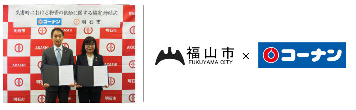 コーナン商事(株)(大阪市淀川区、疋田直太郎社長)は、1月15日(月)に兵庫県明石市と、1月17日(水)に広島県福山市と「災害時における物資の供給に関する協定」を締結した。