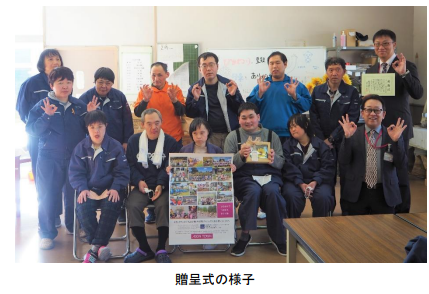 今年度は、約16.2㎏のひまわりの種と参加者2000名の気持ちを込めて、福島二本松でひまわりの種詰め作業を行っている障がい福祉施設「和(なごみ)」と「NPO法人チームふくしま」に寄贈した。贈呈式は1月18日(木)に行われた。