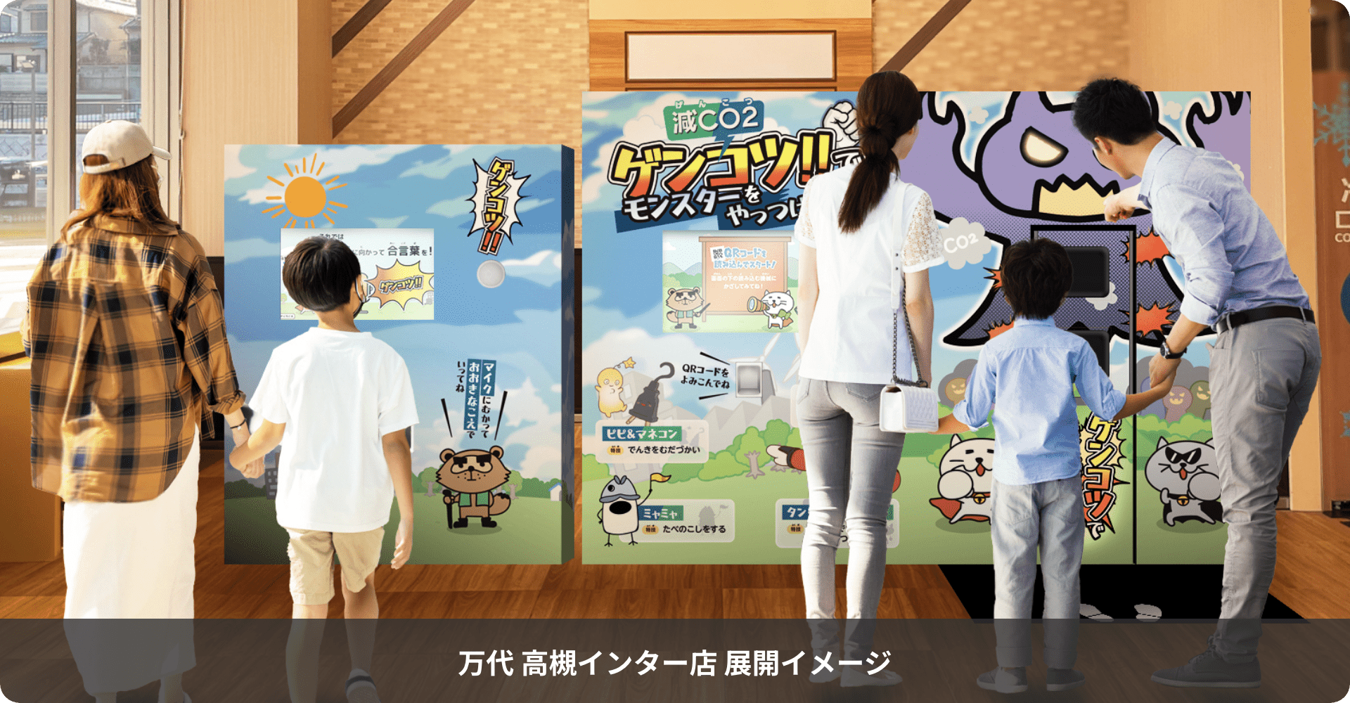 万代高槻インター店では特設棚でゲンコツ商品を販売する。また仕掛学、減CO2謎解きの体験コーナーを設ける。さらにコンテンツを通じて学ぶアプリ施策も相互連携させながら実施していく。