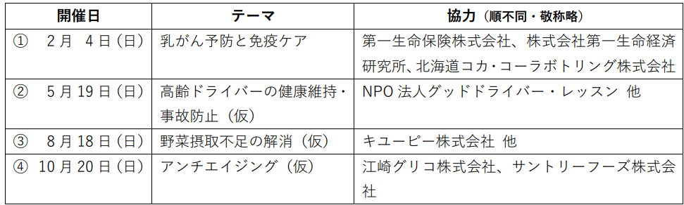 2024年は「脳年齢測定」、「血管年齢測定」、「骨健康度測定」などの健康チェックを実施する。また開催回ごとに「乳がん予防」や「高齢ドライバーの健康維持」といったテーマを設け、セミナーや講習会なども開催する。