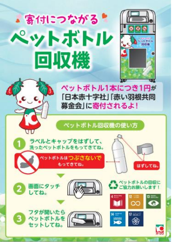 この取り組みは、ペットボトル回収機を店頭に設置し、回収したペットボトル1本につき1円を、オークワから「日本赤十字社」や「赤い羽根共同募金会」といった社会貢献団体に寄付するものである。