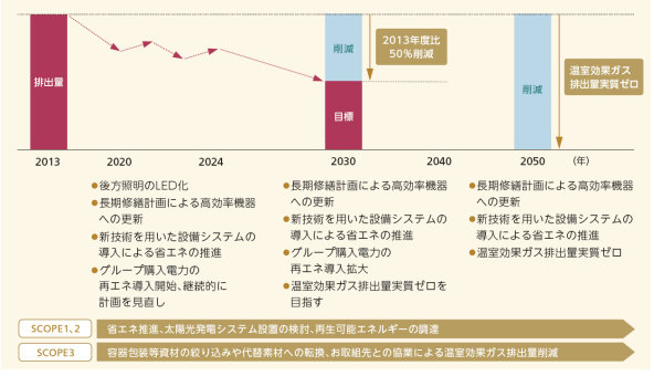 現在、「省エネ・創エネ・再エネ」の3つを軸に気候変動対応に取り組んでいて、循環型社会を目指した4R(Refuse、Reduce、Reuse、Recycle)などに尽力している。これらの取り組みの結果、2022年度の温室効果ガス排出量(Scope1・2)は2013年度比47.6%削減を達成した。また2023年度には、環境や人権などの社会課題に配慮するため、調達方針を改訂し、取組先行動規範を新たに制定した。