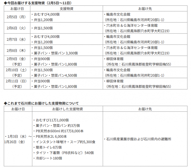 2月5日(月)から追加提供を行っていて、2月11日(日)までに弁当、おにぎり、惣菜パン、菓子パンの提供を予定している。支援物資の提供では、被災地域や行政と連携を強化し対応していて、引き続きメーカーや工場、配送業者などサプライチェーン全体で連携を図りながら、支援物資の提供を続けていく。