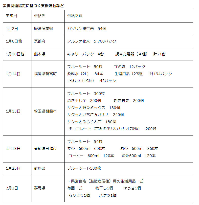 カインズは、全国233の自治体と「災害時における物資の供給に関する協定」を締結しており(2024年2月13日現在)、要請のあった被災地支援を実施する自治体などへ以下のように物資を提供している。