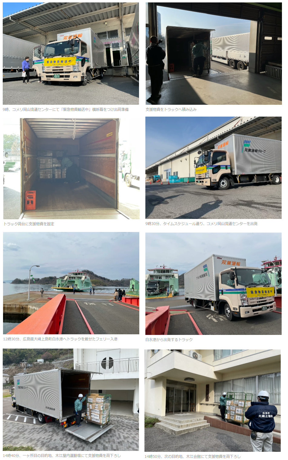 「災害時の支援物資輸送に係る実動演習」では、コメリ災害対策センターが支援物資を備蓄しているコメリ岡山流通センター(岡山市)から広島県大崎上島町の避難所に向けて支援物資の供給、配送について担当し、実動演習を実施した。