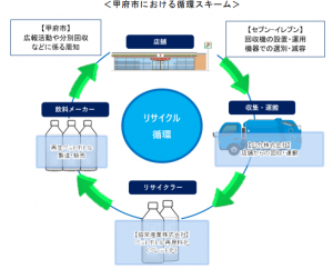 セブンイレブンは2017年12月から、全国各地の自治体や連携企業、加盟店や地域の理解と協力を得て、店舗へのペットボトル回収機の設置を進めている。甲府市とは環境分野における連携協定を締結しており、その取り組みの一環として甲府市内の店舗にペットボトル回収機を設置するに至りました。2024年1月末時点で1都2府31県に拡大し、稼働台数は3444台となった。