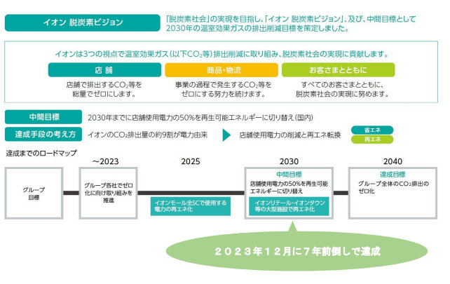 これらの取り組みにより、2023年12月にはイオンの国内事業所における再エネ調達量が、イオンが国内の店舗で使用する電力の約55%に相当する3706百万 kWh に達し、「イオン 脱炭素ビジョン」で掲げた2030年までの中間目標を7年前倒しで達成した。