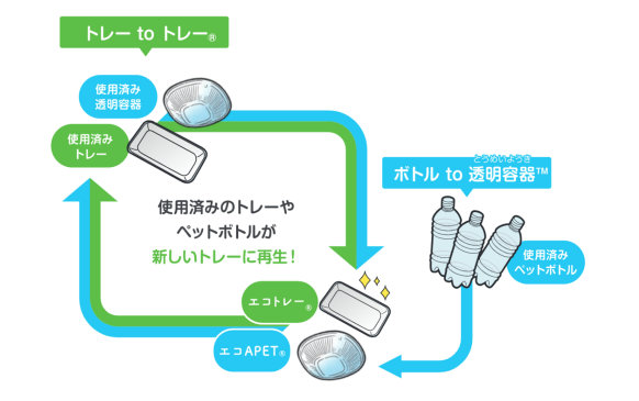 「トレーtoトレー」は店舗で回収された使用済み食品トレーを新たな食品トレーに、「ボトルto透明容器」は使用済みペットボトルを回収して新たな透明容器にそれぞれ再生する水平リサイクルだ。
