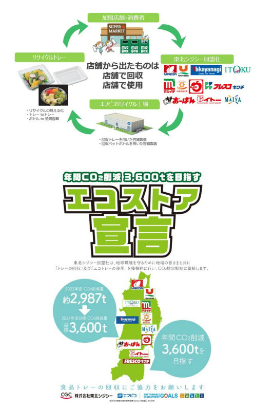 東北シジシー加盟社の店舗では、使用済みトレーやペットボトルを回収し、回収資源から再生されたエコ製品「エコトレー」「エコ APET」を売場で使用することで、2023年度は約2987tのCO2排出抑制に貢献した。