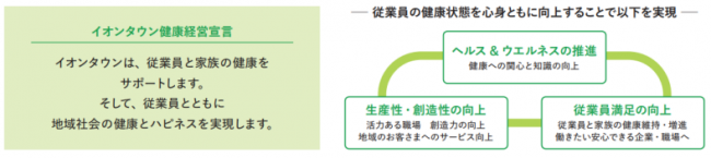イオンタウンは「イオンタウン健康経営宣言」に基づき、従業員と家族の健康をサポートし、従業員とともに地域社会の健康を実現する健康経営に取り組んでいる。イオンタウンの認定は、初めて認定を受けた昨年に引き続き、2年連続となる。