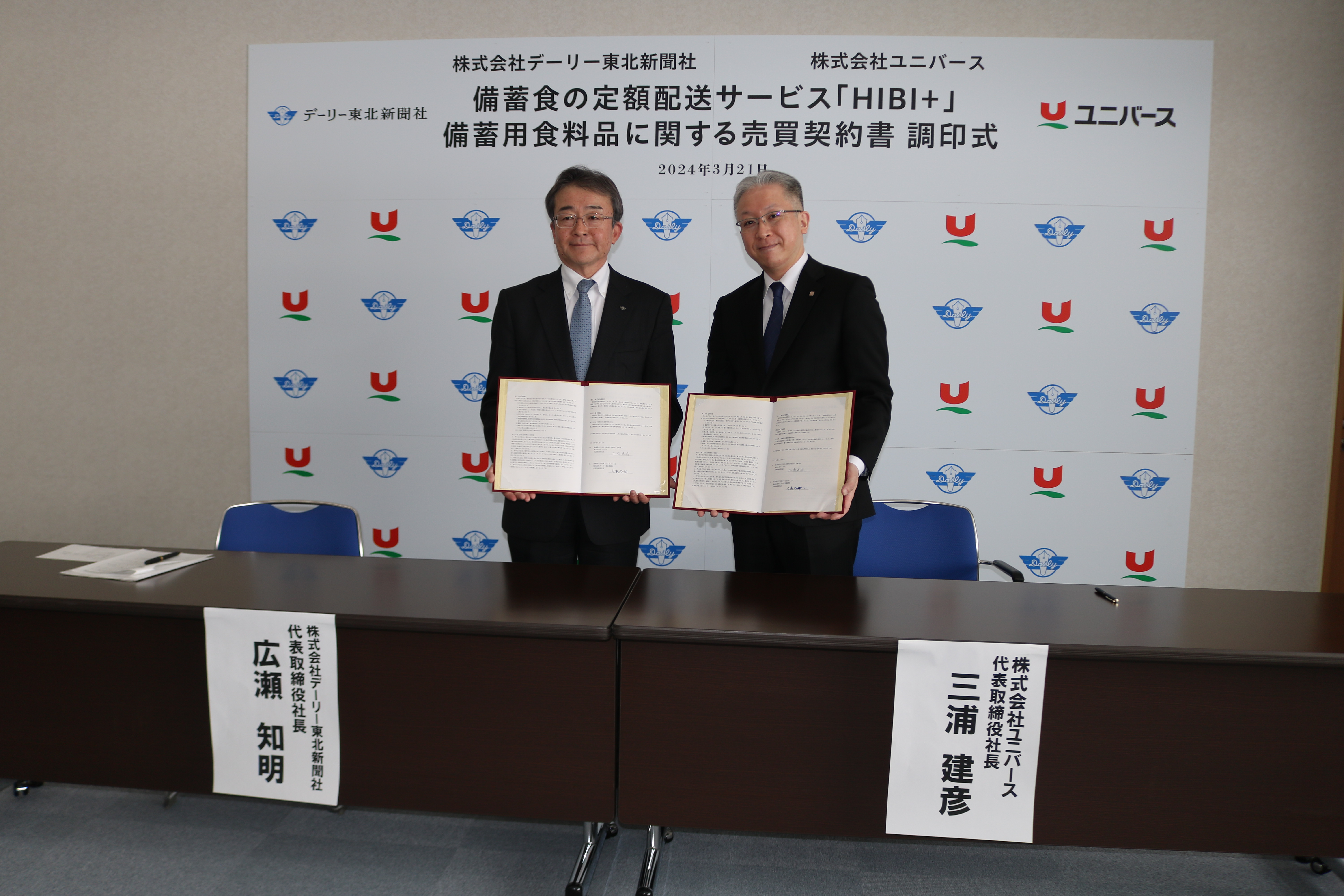 (株)ユニバース(青森県八戸市、三浦建彦社長)は、デーリー東北新聞社が4月1日からスタートさせる備蓄食の定額配送サービス「HIBI+(ヒビタス)」に、パートナー企業として参加する。