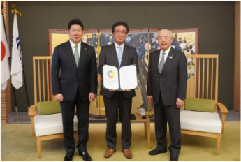 左:川崎市長 中央:岩下代表取締役社長 右:川本理事長