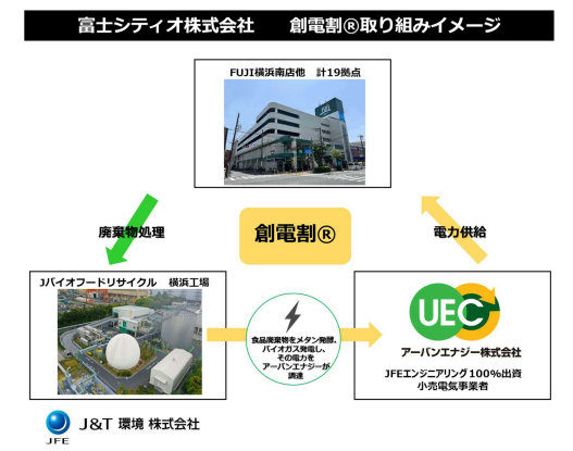 J&T環境(株)(神奈川県横浜市、⾧谷場洋之代表取締役)がコーディネートを実施し、子会社である(株)Jバイオフードリサイクル(神奈川県横浜市、蔭山佳秀社⾧)でメタン発酵後にバイオガス発電を実施。その電力をアーバンエナジーが買い取り、横浜市内を中心とした「Fuji」など19拠点へ供給するもの。