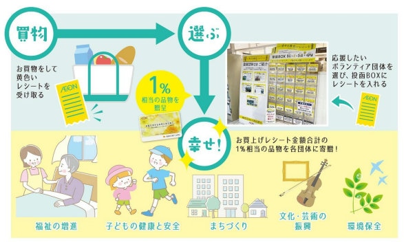 顧客は、精算時に受け取った黄色いレシートを、地域のボランティア団体名が書かれた店内備え付けの投函箱に投函する。イオンはレシート合計金額の1%分の品物をボランティア団体に寄贈する仕組みになっている。投函箱には各団体の活動内容が記載されており、顧客自身が応援したい団体を選択することができる。