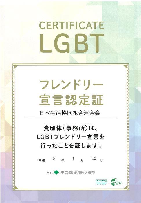 日本生活協同組合連合会(略称:日本生協連、東京都渋谷区、土屋敏夫代表理事会長)は3月12日付けで、東京都総務局人権部から「LGBTフレンドリー宣言企業」に認定された。