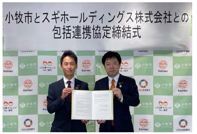 スギホールディングス(株)(愛知県大府市、杉浦克典社長)は 4月4日(木)、愛知県小牧市(山下史守朗市長)と包括連携に関する協定を締結した。
