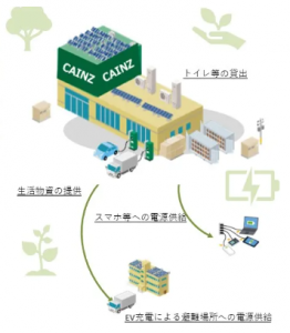 非常時には、このシステムを利用し店舗内のPOSレジシステムや一部の照明・コンセントなどの重要な設備に電力供給を行い、店舗営業を継続させつつ、近隣住民向けにはスマートフォンなどの充電のためにコンセントを開放するなど、地域の一時避難所・復旧拠点としての役割を果たす。