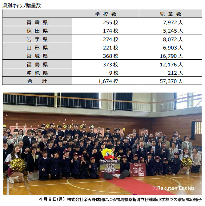 流通スーパーニュース > CSR > やまやnews|東北6県の新小学1年生に「楽天イーグルスキャップ」贈呈 やまやnews|東北6県の新小学1年生に「楽天イーグルスキャップ」贈呈 CSR / 2024年04月18日 ツイート 酒販チェーンの(株)やまや(宮城県仙台市、山内英靖会長)は、(株)楽天野球団(宮城県仙台市、森井誠之社⾧)を通して、東北6県の1665校、新小学1年生5万7158人を対象に、入学記念として「楽天イーグルスキャップ」を贈呈した。 入学年である「2024」が刻まれ、小学校生活を安全で楽しく過ごせるようにという願いが込められた「楽天イーグルスキャップ」は、4月初旬から順次、各学校へ送付される予定。 ツイート