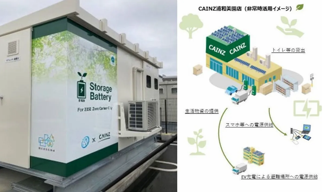 カインズ浦和美園店では、太陽光発電設備と蓄電池を使用したシステムを導入した。平常時には、店舗で使用する電力の約4割を再生可能エネルギーで賄い、年間約220tのCO2削減効果を見込む。一方、非常時には店舗内のPOSレジシステムや一部の照明・コンセント等の重要な設備に電力を供給し店舗営業を継続しつつ、近隣住民向けにスマートフォン等への充電のためにコンセントを開放する等、地域の一時避難所/復旧拠点としての役割を果たす。
